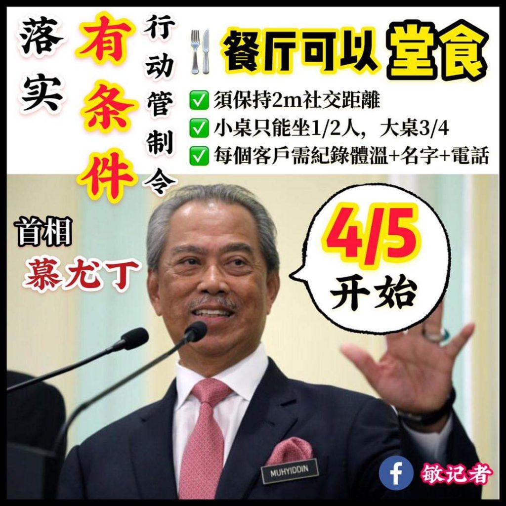 行管令504起 · 转为有条件性行管令即时国内(布城1日讯)首相丹斯里慕尤丁今日宣布,从5月4日起,全国行动管制令转为“有条件性行管令”(PKPB)。首相指出,届时将允许商业活动和社交活动有条件地恢复运作,并需遵守标准作业程序(SOP)。“无论如何,涉及多人的集会或群聚活动仍被禁止。”首相于今早11时在全国直播演说上发表劳动节贺词时,同时作出以上宣布。