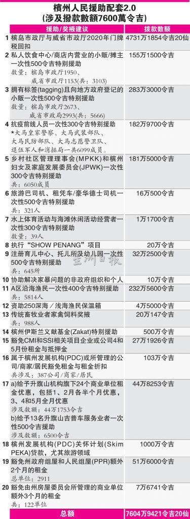 (槟城6日讯)槟州首席部长曹观友宣佈槟州人民援助配套2.0, 政府将拨出共7600万令吉。曹观友今日通过脸书直播宣佈,一些小贩因注册的方式不同,而没有在之前的槟州人民援助配套1.0中受惠,州政府决定拨出438万令吉协助这些小贩,他们包括小贩中心的小贩、流动小贩、咖啡店小贩共8769人,每人可获500令吉。