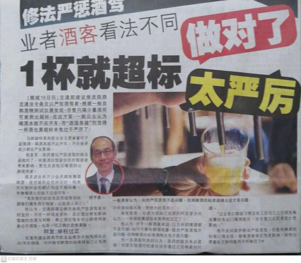 马新咖啡茶业联合总会会长拿督何子孟强调,喝酒本就不应开车,不论是多或少都会产生影响。他直言,政府建议严惩酒驾的做法是做对了,毕竟酒后驾驶非但对驾驶者带来影响,更危及其他没喝酒的公路使用者。提及该会有不少会员都有售卖啤酒,是否接到会员投诉时,他表示大部分会员都认为这不是坏事,毕竟喝酒之后就不应该开车。“其实我们的会员反而经常劝告顾客们避免酒后驾驶,以免误人误己。”他认为,交通部建议修改条例严惩酒驾是合时宜的,不论一杯或是多杯,总之酒后难免影响驾驶的态度与判断,禁止酒后驾车对公路使用者是公平措施,也是一项正确的思想灌输。对于一般酒客来说政府的做法未必是错,但是无钱请司机者在法令通过之后将面对问题和肯定大受影响。