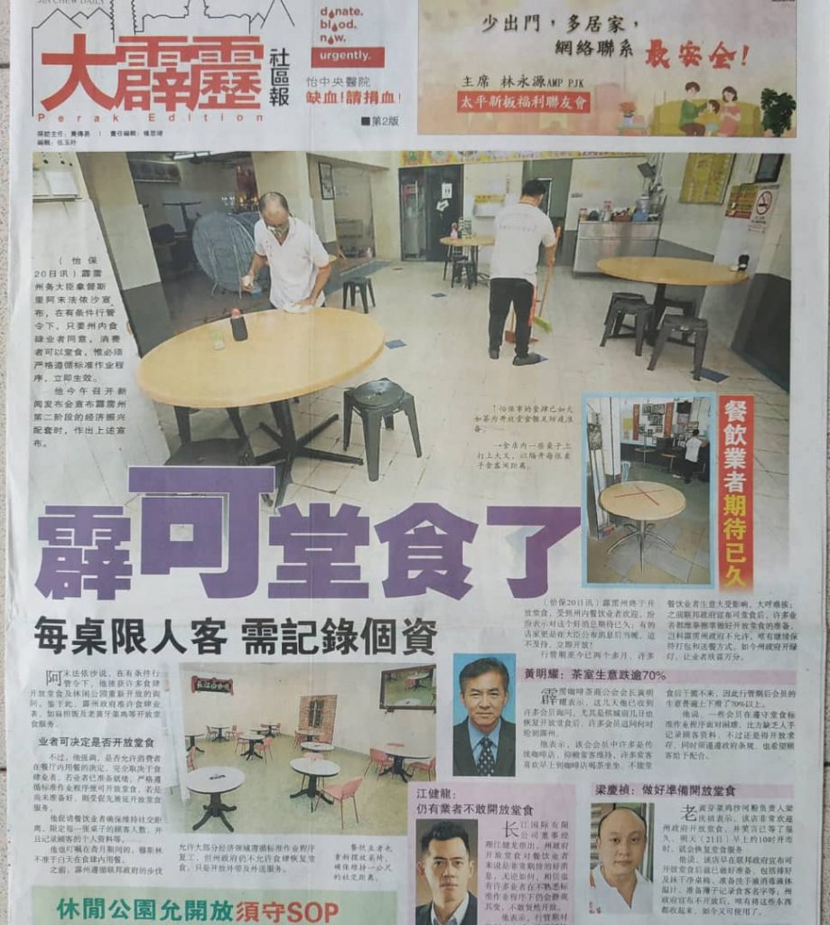 早前,尽管霹雳州遵循联邦政府的步伐,允许大部分经济领域遵循标准作业程序复工,不过,霹州政府仍不允许食肆恢复堂食,只是开放外带及外送服务。